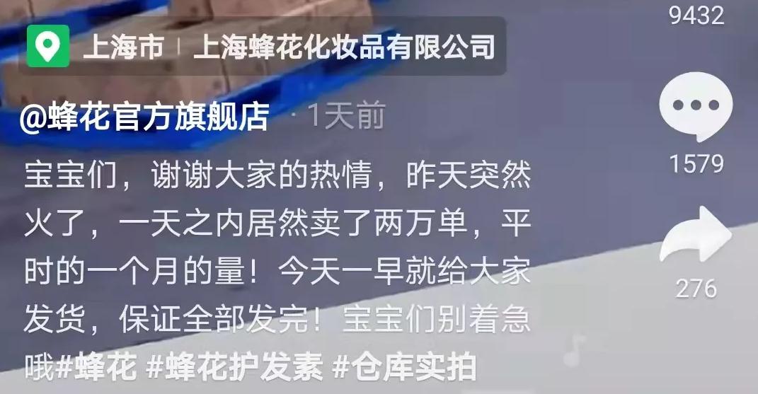 蜂花官方宣布,喜提热搜之后,直播间一天内卖出2万多单,差不多是平时一个月的销量。天猫旗舰店里,最受欢迎的一款护发素套装目前已经达成月销10w+的小目标。