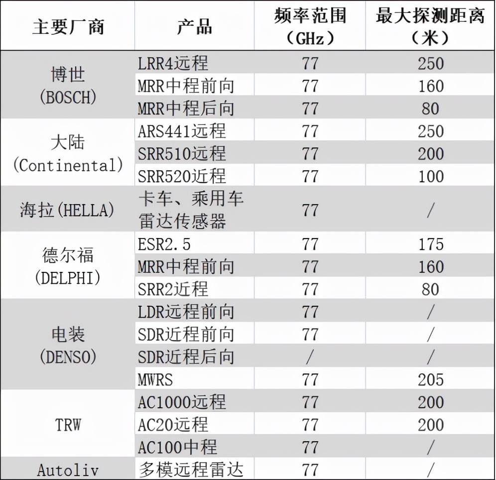 各大厂商77GHz毫米波雷达主要产品 资料来源于博世等公司官网、中信证券研究院、东方证券研究所