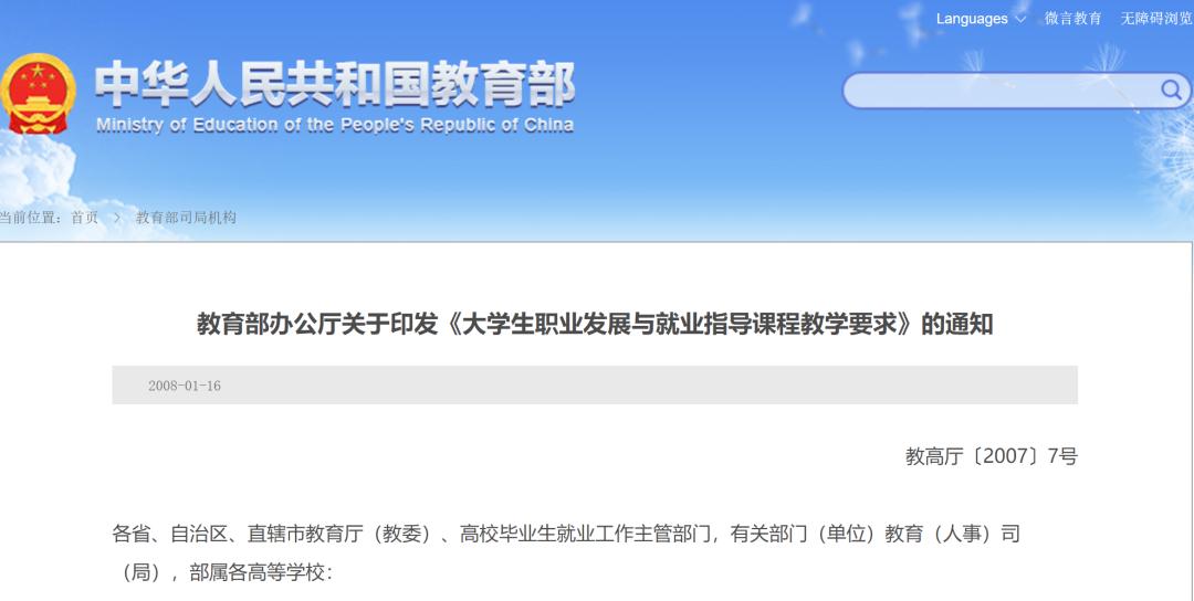 具体到目前我们高校所开设的职业规划课程,相关部门也曾经给出过明确答案。例如我国教育部办公厅就在2007年印发过一份关于《大学生职业发展与就业指导课程教学要求》的通知,正文第一章节给这门课程定了性: