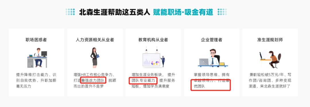 这些机构服务的群体也非常有针对性。除了处于择业阶段的应届毕业生等“职场困惑者”,HR、企业管理者、教育机构从业者也被认为是最适合进行“生涯规划培训”的群体,并且拥有一个相同的学习目标:打造优秀团队。