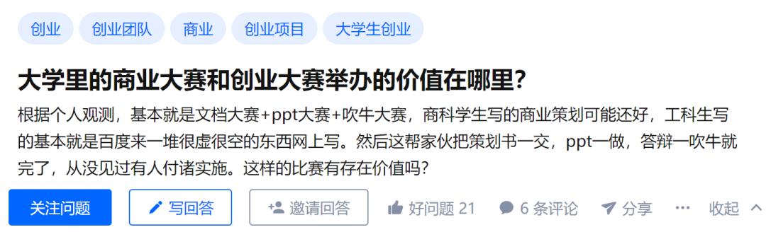 ——这似乎是老师们也有意无意认可的结果。知乎用户王镇雷就根据自己的经历认为“创业大赛”的本质其实就是“创业计划大赛”,强调的是“规划”,绝大部分参赛作品可能都是利用老师或者前辈的科研半成品来进行包装和加工,提出的创意或者专利未必是自己团队的,学生们最能获得参与感更多的是会在老师和同学的帮助下,所还原的流程化办公、压力面试。