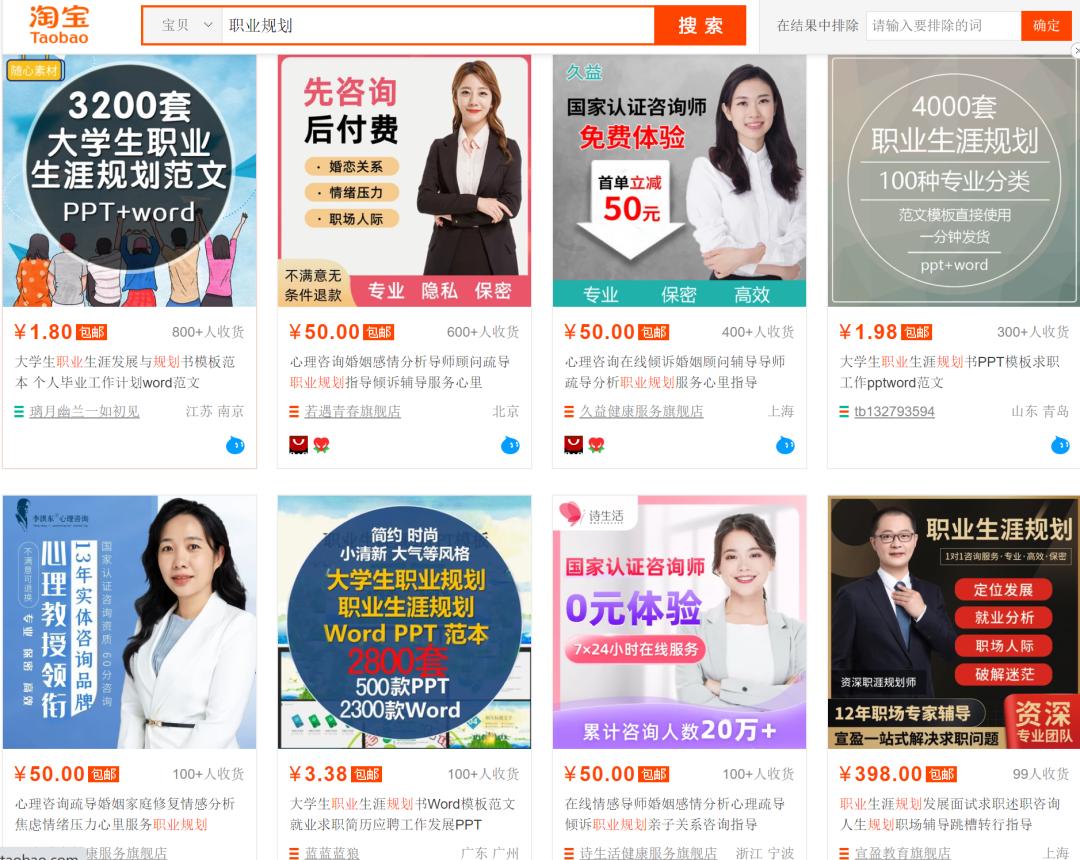 也可以成为快消品。一次号称“专业”“国家认证”的职业规划咨询在某宝上定价在50元到500元不等,搜索结果首页相当一部分卖家月销量能达到100+,个别在宣传文案上声称“累计咨询销量20W+”。