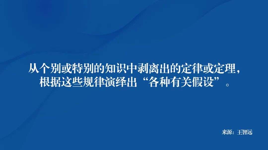 在科学研究中把它拆分为:从个别或特别的知识中剥离出的定律或定理,根据这些规律演绎出“各种有关假设”。