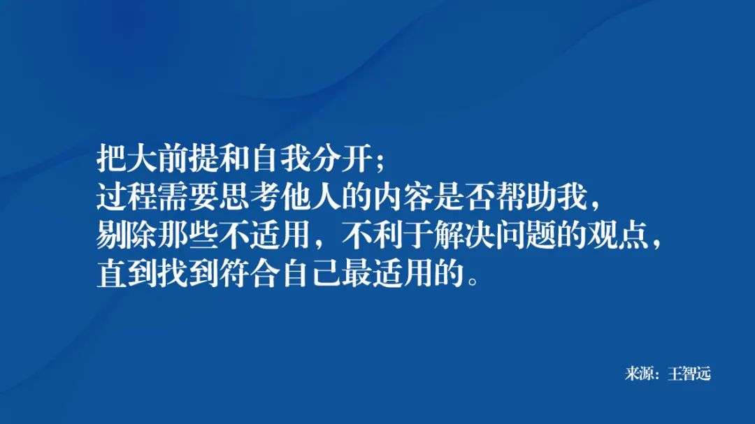 所有一切不能盖棺定律;因此判断就要学会自我切割,把大前提和自我分开;过程需要思考他人的内容是否帮助我,剔除那些不适用,不利于解决问题的观点,直到找到符合自己最适用的。