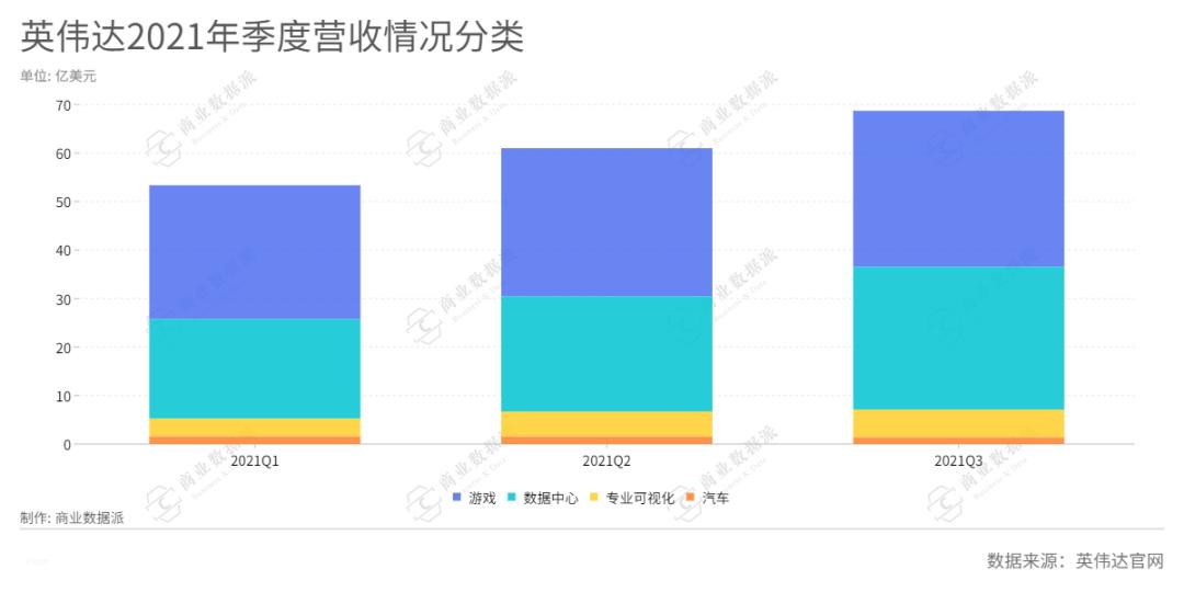 英伟达第三季度财报中,其71亿美元营收主要由游戏、数据中心、专业可视化和汽车四大板块构成,而令投资者看好英伟达的核心原因在于英伟达在游戏以及数据中心业务方面的突破,这两项业务不但保持了快速的增长势头,也是营收的主要推动因素,均高于市场预期,成为推动英伟达市值上升的“两板斧”。