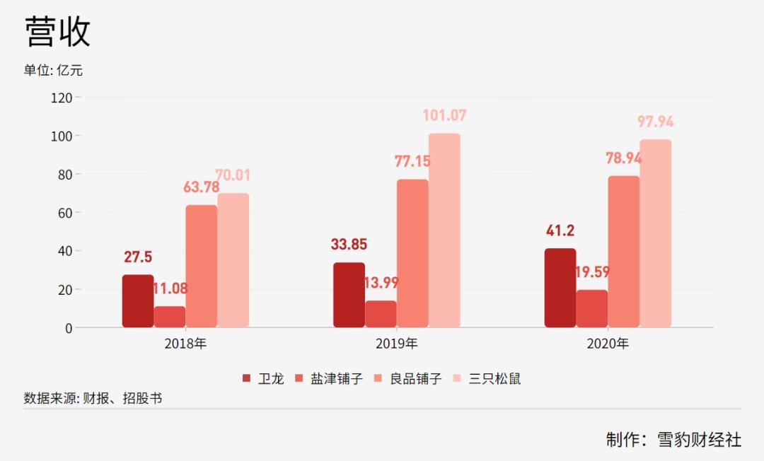 在营收规模上,2018年至2020年,卫龙总营收分别为27.5亿、33.9亿、41.2亿元,年复合增长率达到22.4%。作为对比,盐津铺子在2018年到2020年的营收为11亿、14亿和19.6亿元,也就是说,卫龙2020年一年的营收就已接近盐津铺子的三年之和了。