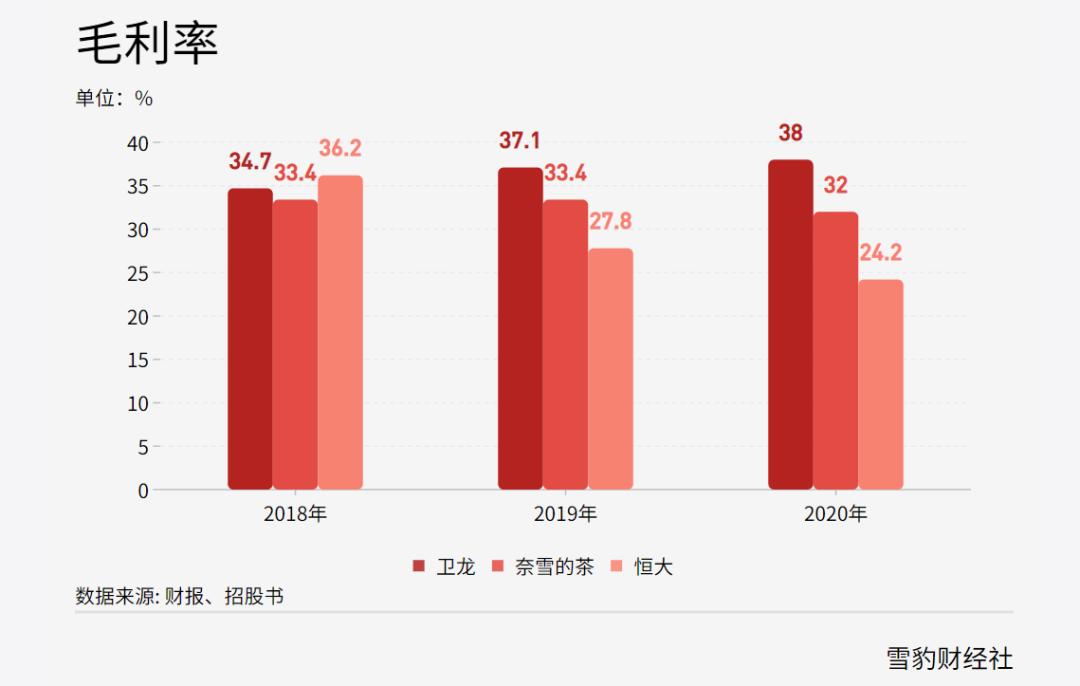 即便跨赛道比较,卫龙的表现也不遑多让。2018年至2020年,卫龙的毛利率不仅超过了新茶饮企业奈雪的茶,连房地产企业也相形见绌,中国恒大同期的毛利率分别为36.2%、27.8%、24.2%。