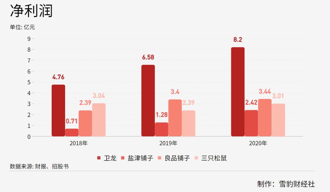 卫龙在2018年到2020年的净利润分别为4.76亿元、6.58亿元以及8.19亿元,而深耕零食赛道多年的三只松鼠近三年的净利润也仅有3.03亿、2.39亿和3.01亿元。