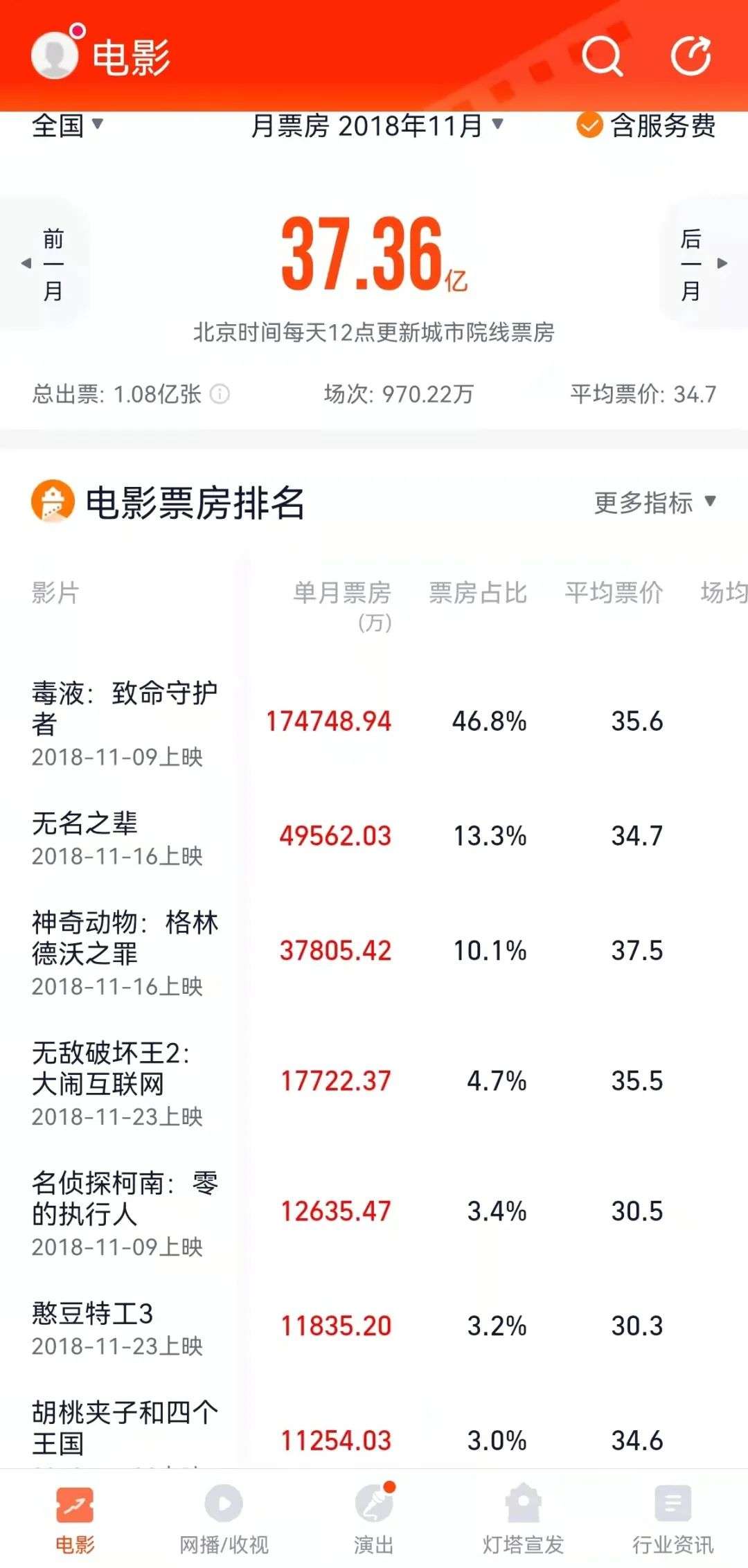 而从过去的经验里,不难发现解决这个问题的办法:超级爆款存在的同时,需要数量更多的、品质过硬的中小成本影片持续稳定地供给。像在历年11月里票房表现最好的2018年,因为有“《毒液》+《无名之辈》”的组合,和另外5部票房过亿的影片,才达到了37.36亿的高票房。