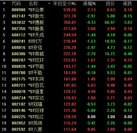 年初以来,ST板块跑出多只“大牛股”,*ST众泰涨超530%,*ST新光、*ST德新涨超350%,*ST赫美、*ST天成等涨幅也都在2倍以上。