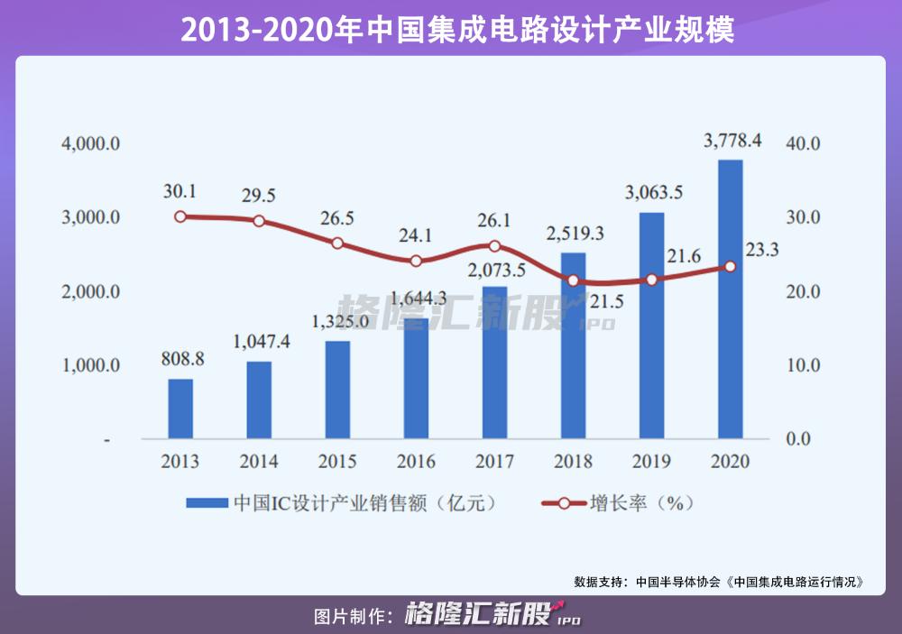 中国在集成电路产业起步较晚,但伴随庞大的市场需求及利好的政策支持,中国集成电路设计产业发展较快,产业销售额从2013年的808.8亿元增长至2020年的3778.4亿元,年均复合增长率约为24.63%。