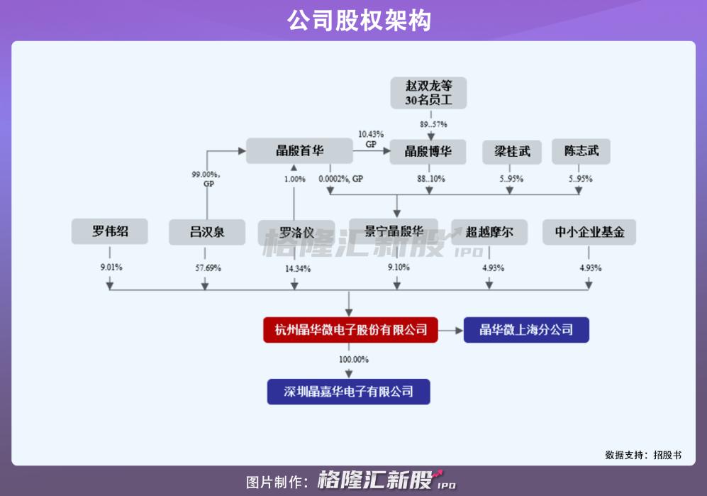 招股书显示,吕汉泉直接持有公司57.69%的股份,通过景宁晶殷华间接控制公司9.10%的股份,是晶华微的控股股东;罗洛仪直接持有公司14.34%的股份,吕汉泉、罗洛仪夫妇合计控制公司81.13%的股份,是晶华微的实际控制人。