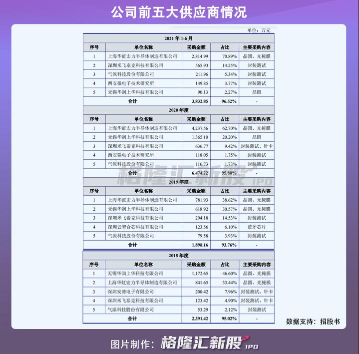 自成立以来,晶华微始终采用集成电路设计行业典型的Fabless经营模式,主要从事芯片的研发与设计,自身不从事生产活动,生产环节由专业的晶圆制造和封装测试厂商完成,报告期内,公司前五大供应商的采购金额分别为2391万元、1898万元、6474万元和3833万元,采购占比分别为95.02%、93.76%、95.80%和96.52%,采购集中度相对较高,如果供应商出现产能紧张或发生不可抗力事件,很可能无法满足公司的采购需求,将对公司的生产经营造成不利影响。