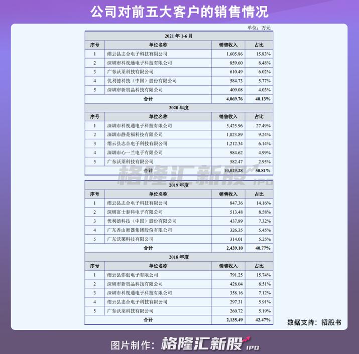 报告期内,晶华微对前五大客户的销售金额分别占比42.47%、40.77%、50.81%和40.13%,其中2021上半年前五大客户包括缙云县志合电子、科视通电子、沃莱科技、优利德科技和新贵晶科技。