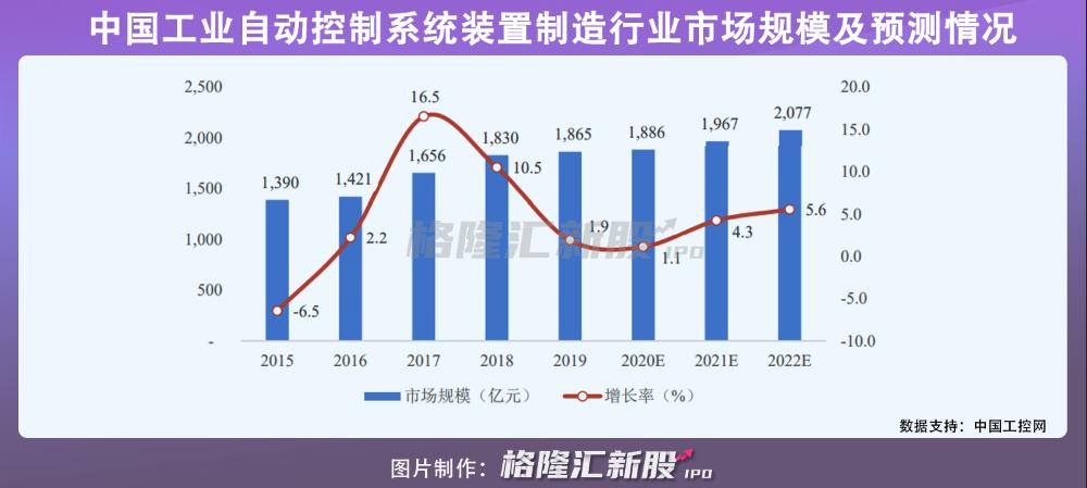 另一方面,随着自动化、智能化逐渐成为趋势,机器代替人工的进程加速,制造业工控需求日益增加,中国工业自动控制系统装置制造行业市场规模已从2015年的1390亿元增长至2019年的1865亿元,年均复合增长率达到7.63%,预计2022年市场规模达2077亿元。