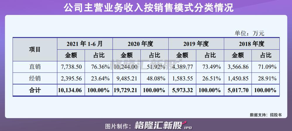 从销售情况来看,公司直销收入占主营业务收入的比例分别为71.09%、73.49%、51.92%和76.36%,经销收入占比分别为28.91%、26.51%、48.08%和23.64%。2020年,经销收入占比上升较快,主要是因为公司第一大经销客户科视通采购金额上升所致,科视通的终端客户为国内知名红外测温枪制造厂商倍尔康,该公司生产的红外测温枪约占国内市场份额的三分之一。