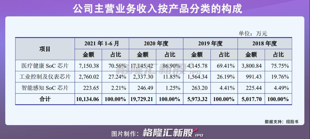 2018年至2021年上半年,公司主营业务包括医疗健康SoC芯片、工业控制及仪表芯片和智能感知SoC芯片,其中医疗健康SoC芯片是公司的主要收入来源,报告期内分别占比营收75.75%、69.41%、86.9%和70.56%。值得注意的是,受疫情影响,红外测温枪等防疫物资需求爆发,公司医疗健康SoC芯片中的红外测温信号处理芯片销售实现了快速增长,使得2020年收入大幅增长,不过随着疫情逐步得到控制,晶华微该业务的业绩增长或逐渐放缓。