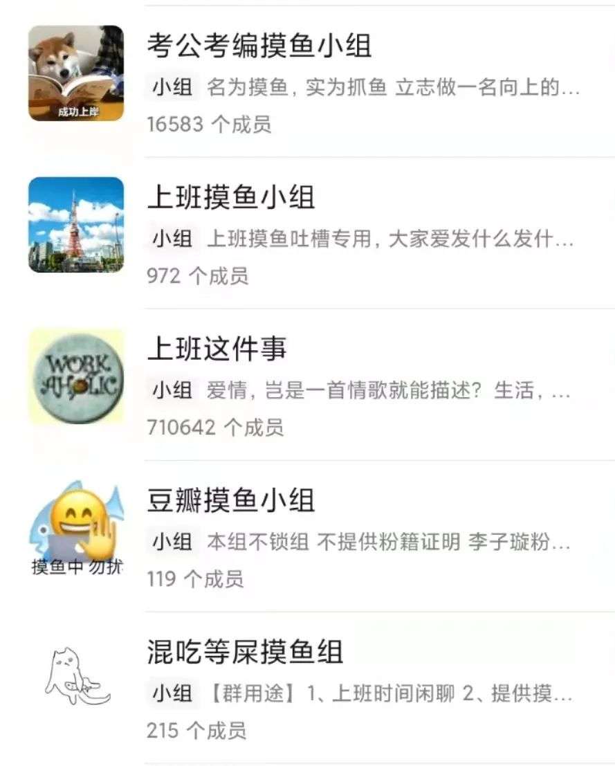 在某MCN工作的丹妮在和KOL对接时,会同时和豆瓣小组的“摸鱼小队”聊天。这群志同道合的“鱼仔”,聊天方式是一篇“腾讯在线文档”。按照“话题”与“回复”索引,小队成员可根据偏好进行回复。单休还是双休、外卖是米粉还是包子、新人真的难带......琐碎的吐槽与探讨,让这一简单的在线文档愉悦了丹妮的身心,也让这些来自不同职业的“打工人”短时间内组成了一个“摸鱼共同体”。