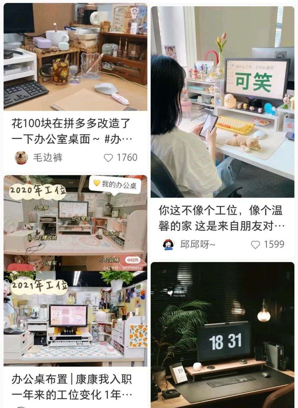 第三类:美学类。作为“摸鱼经济”的最高级形态,摸鱼美学已融入了年轻人的日常生活中。以工位为例。“桌搭“又被称为“桌面搭配”,是摸鱼美学江湖的重要流派。从桌垫、杯垫再到鼠标垫,从水杯、手办到小家电,季节不同,工位的色系也不同。作为打工人的另一个“家”,工位成了消费主义的另一大战场。