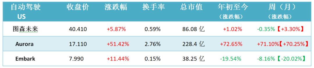 此外,在美股上市的自动驾驶公司也出现大涨,包括两个卡车自动驾驶公司Embark和图森未来,全球自动驾驶第一股的图森未来大涨接近6%,股价在发行价徘徊迎接解禁潮的大佬。而另一个刚上市的Embark没有解禁压力,股价大涨11.44%。