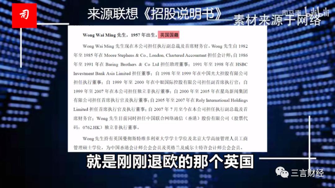司马南指出,联想的招股书中讲清了联想一共27个高管,有14个是外国人。其中,联想首席财务官黄伟明是英国人,联想首席技术官芮勇是美国人。