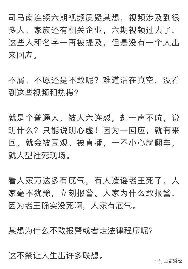 有人认为司马南连续六期视频质疑联想,视频涉及到很多人、家族还有相关企业,但是没有一个人出来回应,是心虚的表现。
