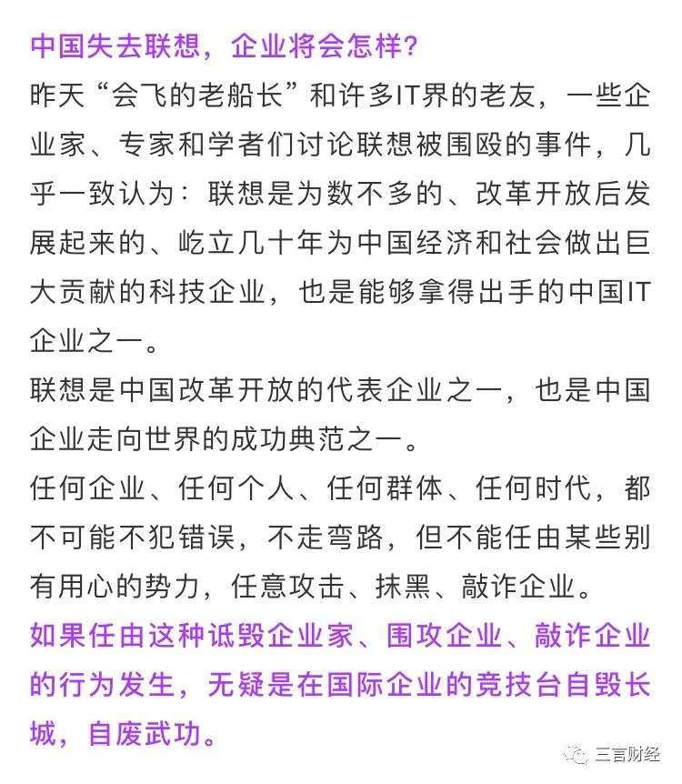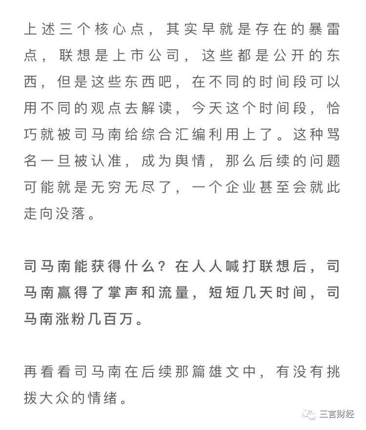 有人认为联想是上市公司,这些公开的东西在不同的时间段可以用不同的观点去解读。这个时间段,恰巧就被司马南给综合汇编利用上,挑拨大众的情绪。在把联想弄得人人喊打后,司马南赢得了掌声和流量,短短几天时间,司马南涨粉几百万。
