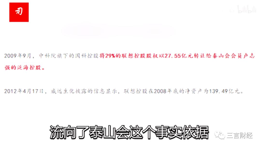 司马南指出,2009年,中科院以27.55亿元将联想控股29%的股权出让给了卢志强的泛海控股,而卢志强是泰山会的成员。联想控股在2008年年底净资产是139.49亿元,29%的股权应该是40.45亿元,而中科院出让29%联想控股股权只有27.55亿元,差价12.90亿元。