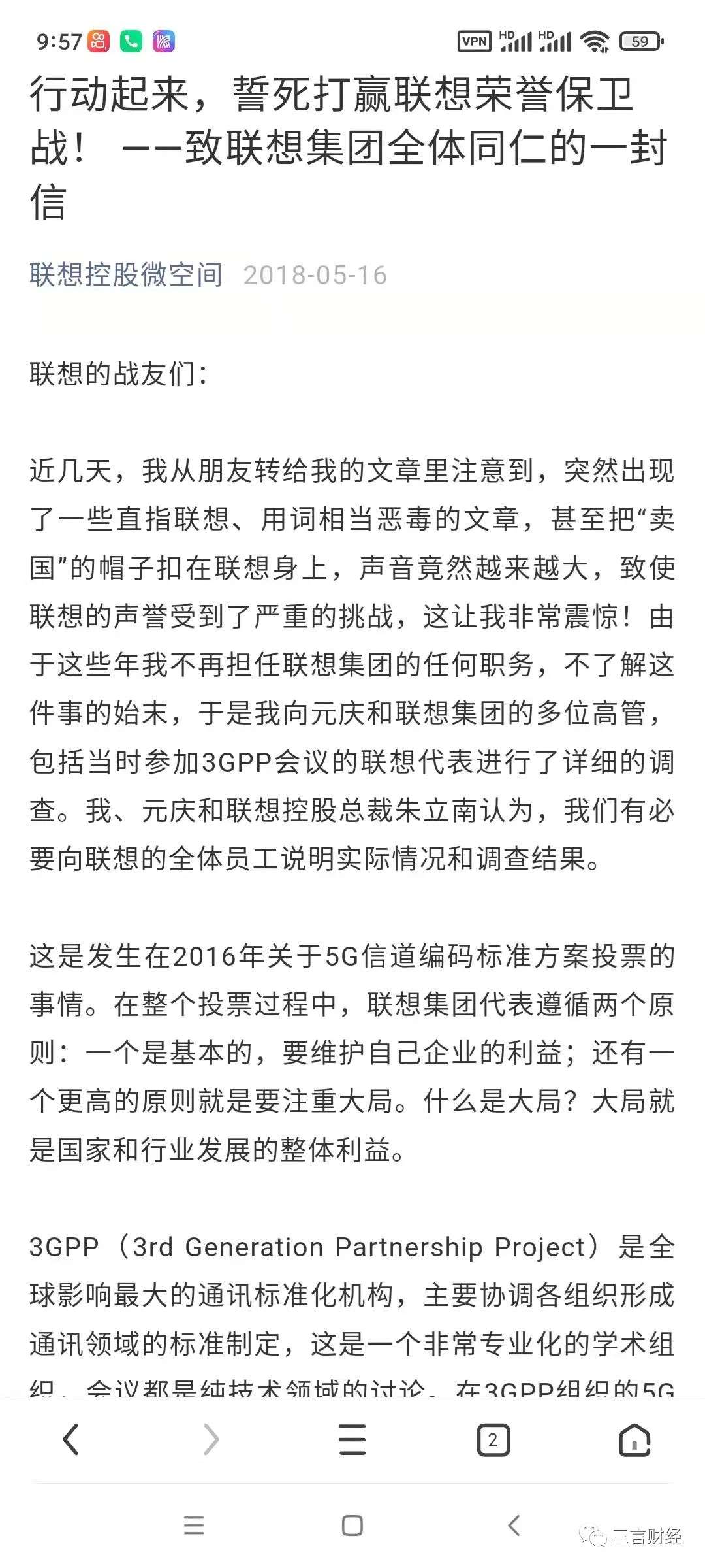 柳传志、杨元庆、朱立南也曾联名发布公开信解释5G投票。信中称,联想集团代表遵循两个原则:一个是基本的,要维护自己企业的利益;还有一个更高的原则就是要注重大局。大局就是国家和行业发展的整体利益。
