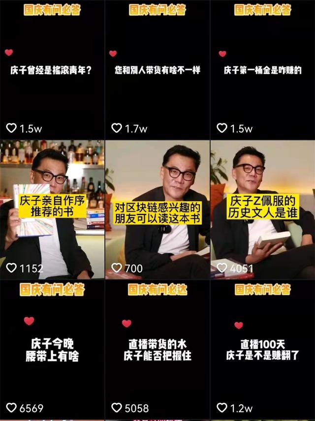 他的短视频封面文案的称呼,也经历了从“国庆”、“老李”到“庆子”的转变。诸如“庆子什么时候东山再起”、“庆子今晚裤腰带上有啥”、“庆子曾经是摇滚青年?”等,“庆子”出现的频次越来越高。