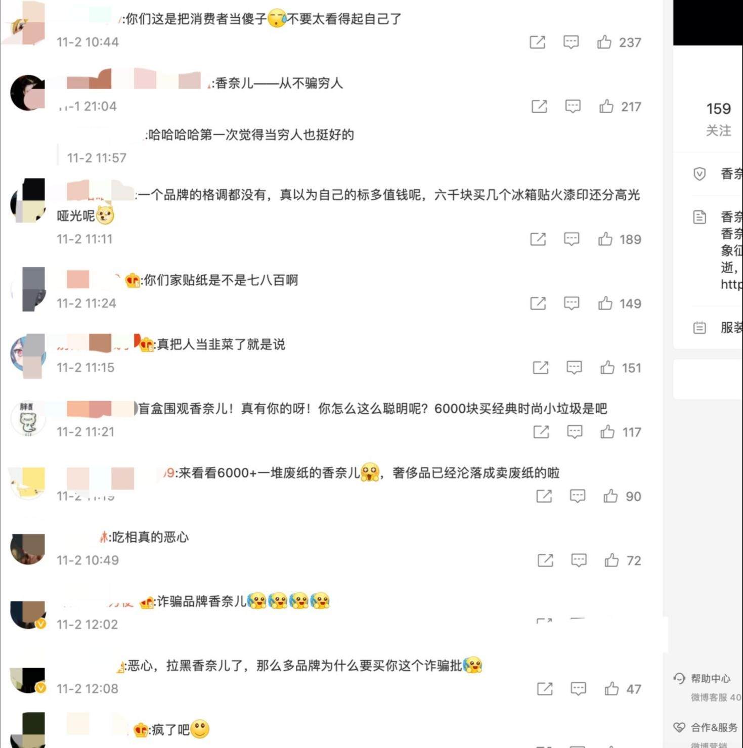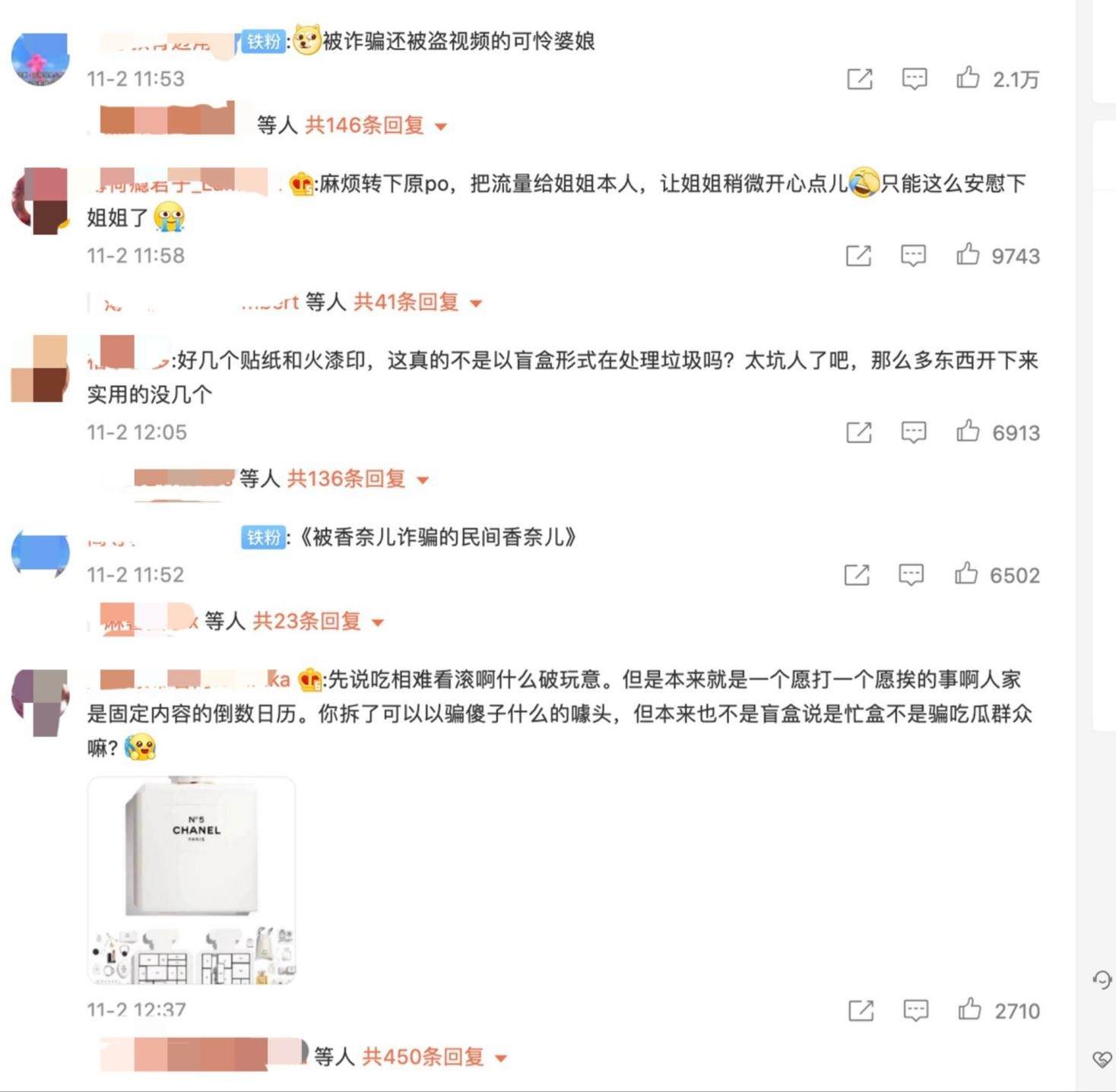 因此,虽然有网友强调香奈儿推出的是“礼盒”,不是“盲盒”,每一个礼盒只是拆除的顺序不一样,内容是一样的,但依然有不少网友到香奈儿的官网微博评论称,“诈骗盲盒”、“6000多元买几个冰箱贴火漆印还分高光、哑光”。