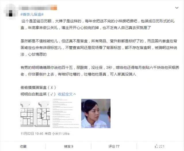 但也有网友认为:“本来就是一个愿打愿挨的事,人家是固定内容的倒数日历,本来也不是‘盲盒’,说成是盲盒不是骗吃瓜群众吗?”