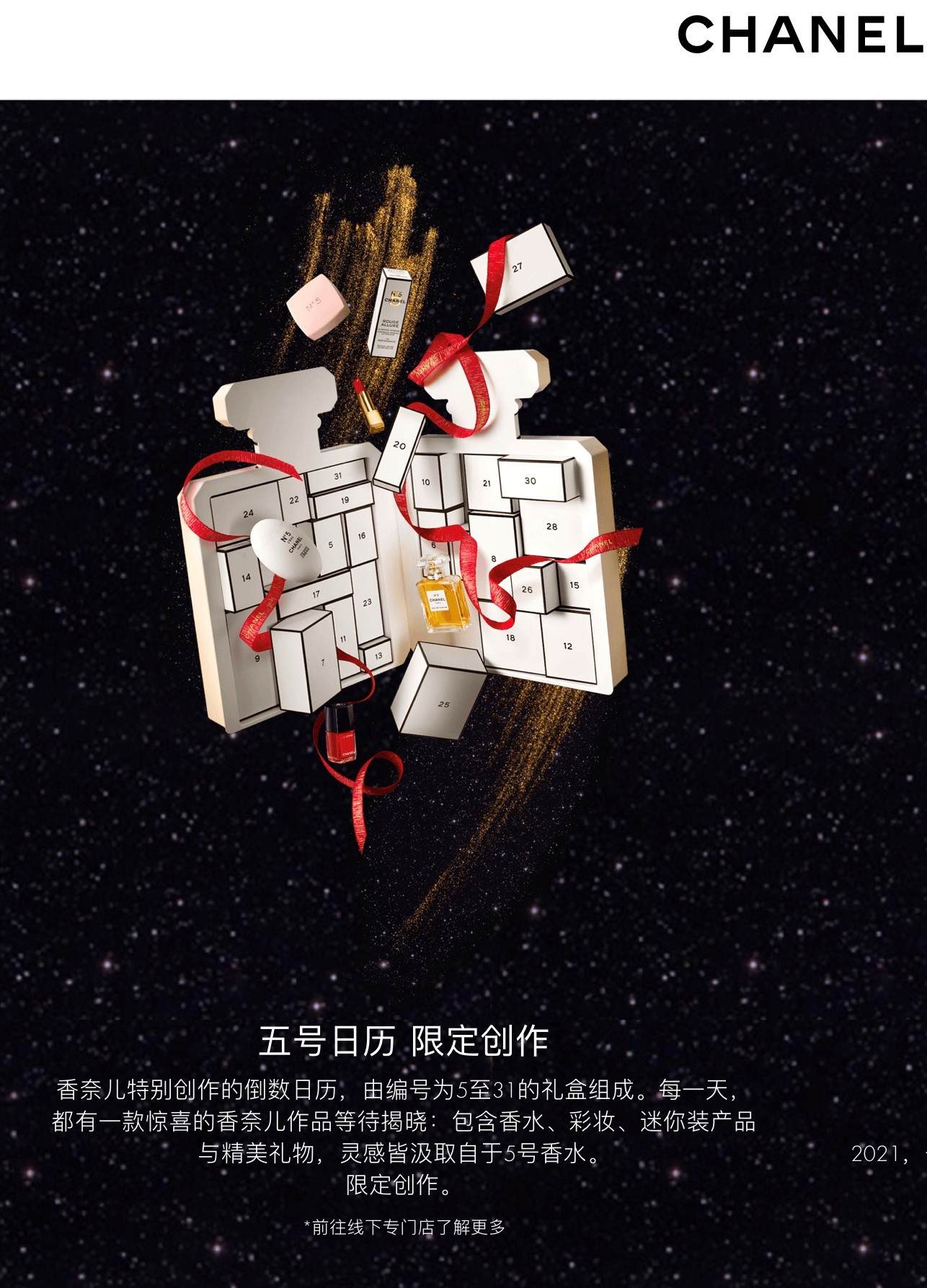 而下方的文案写到,“五号日历 限定创作”香奈儿特别创作的倒数日历,由编号为5至31的礼盒组成。“每一天,都有一款惊喜的香奈儿作品等待揭晓:包括香水、彩妆、迷你装产品与精美礼物。”