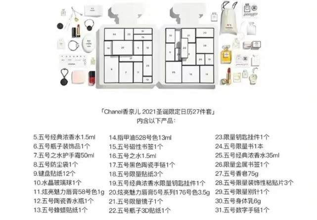网上流传一张香奈儿倒数日历礼盒全部详情信息,但在香奈儿官网和店铺均未找到这份列表。