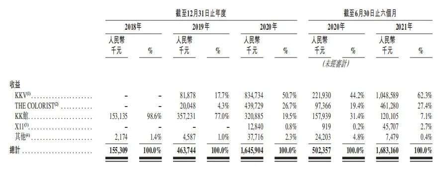 自成立以来,KK集团快速增长,其总收益及增长率相当可观。由2018年始截至2020年,总收益分别为1.55亿、4.64亿、16.46亿。2021年上半年的收益甚至超过2020年全年,达到16.83亿,收益大幅增加主要由于2020年下半年开始KKV及THE COLORIST门店的加速扩张,从而使货品销售增加。