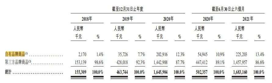 据招股书显示,于2018年至2020年及2021年上半年,第三方品牌商品贡献收益远大于自有品牌商品,销售自有品牌商品产生的收益分别占总收益的1.4%、7.7%、12.3%、10.9%及13.4%,呈缓慢上升趋势。