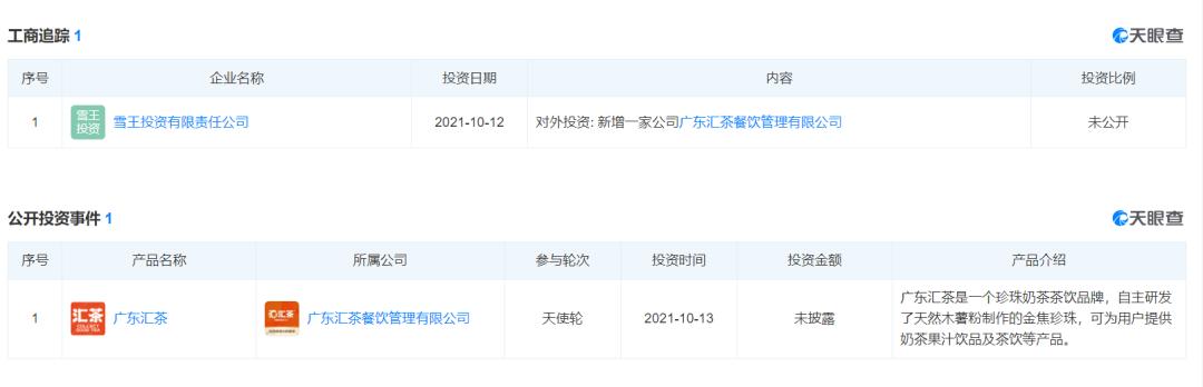 雪王投资成立一个月后,就出手投资了名为“汇茶”的广东茶饮品牌。汇茶成立于2015年,大本营位于广东东莞,门店主要分布在广东和海南两个地区。