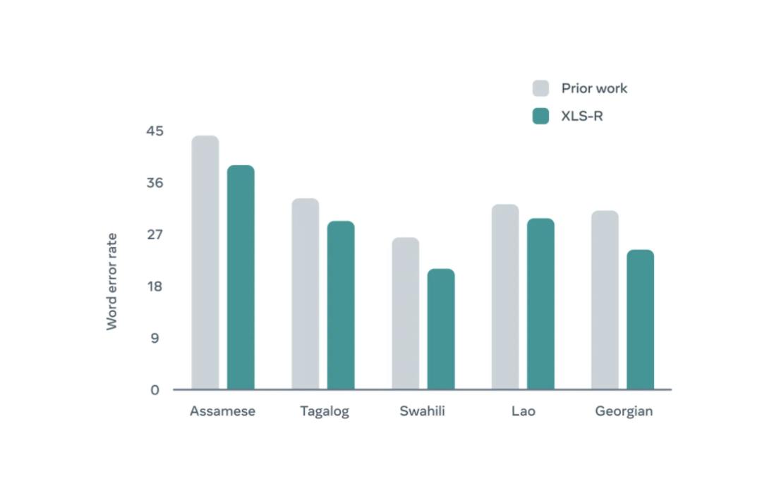 Meta 在四种主要多语言语音识别测试中对 XLS-R 做出评估,发现它在 37 种语言上获得了超越以往模型的效能。具体测试场景为:BABEL 中选取 5 种语言,CommonVoice 中选取 10 种语言,MLS 中选取 8 种语言,以及 VoxPopuli 上选取 14 种语言。