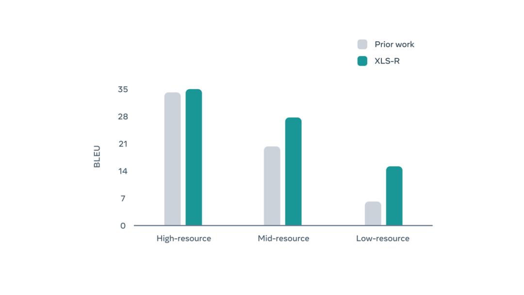 在使用 XLS-R 对英语以外的其他语言进行编码时,获得了显著的效能提升,这也是多语言语音表达领域的一次重大突破。据 Meta 介绍,XLS-R 在低资源语言学习中实现了显著改进,例如印尼语到英语的翻译,其中 BLEU 准确率平均翻了一番。BLEU 指标的提升是指模型给出的自动翻译结果与处理同一内容的人工翻译结果间重合度更高,代表着模型在改进口语翻译能力方面迈出了一大步。