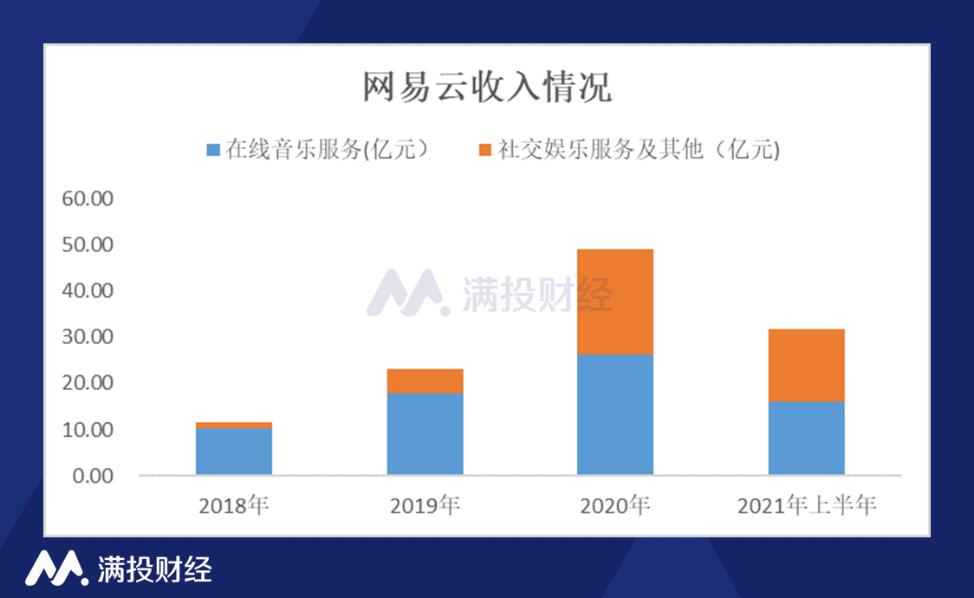 网易云的收入主要来源于在线音乐服务和社交娱乐服务,根据招股书最新数据,2021年上半年,网易云音乐实现总收入31.84亿元,同比增长60.9%,其中在线音乐服务收入16.04亿,社交娱乐服务收入15.79亿。社交娱乐收入的占比已经攀升至与在线音乐服务收入占比相当,成为网易云音乐非常重要的变现途径。
