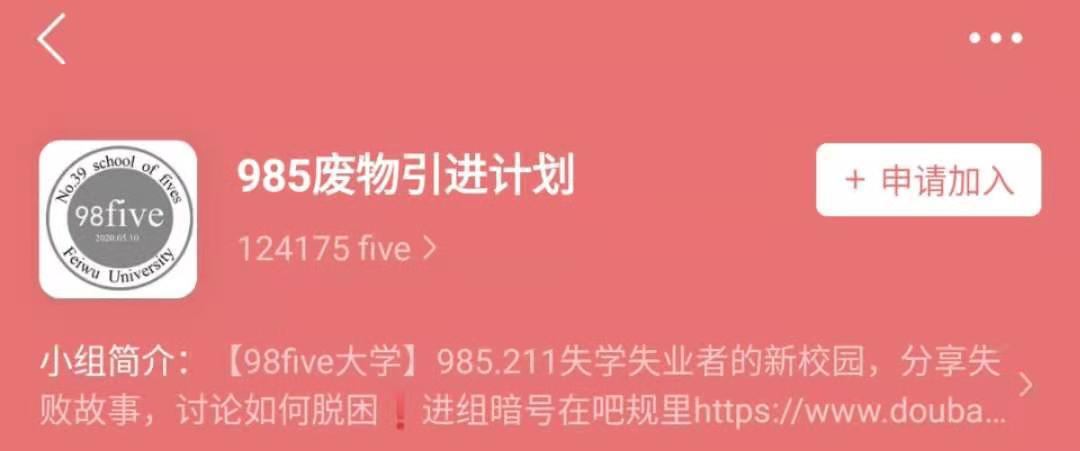 在豆瓣有个小组名叫“985废物引进计划”,进入这个小组的成员大多毕业或就读于是985、211高校。