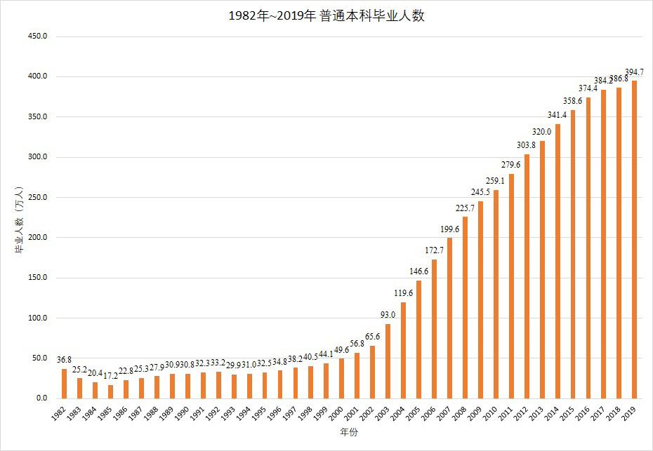 让我们来看一组数据,自1982年到2019年,累计普通本科的毕业人数约5330万,现在中国人口总数约为14亿,本科学历占比人数约3.8%。