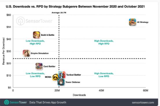 根据Sensor Tower的统计,在策略手游的七个细分品类中,4X策略游戏过去12个月在美国市场的营收最高,达到29亿美元,同比增长了32.5%。不过,营收增长速度最快的细分品类是MOBA,1.684亿美元的总收入同比增长了超过50%。