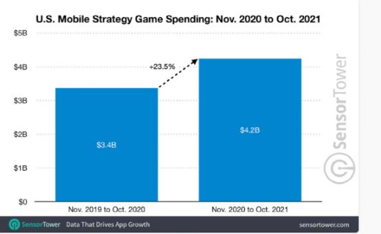 前不久,Sensor Tower在官网的一篇博客文章中指出,过去一年美国玩家在移动平台策略游戏中的累计消费额达到42亿美元,同比上升了23.5%。