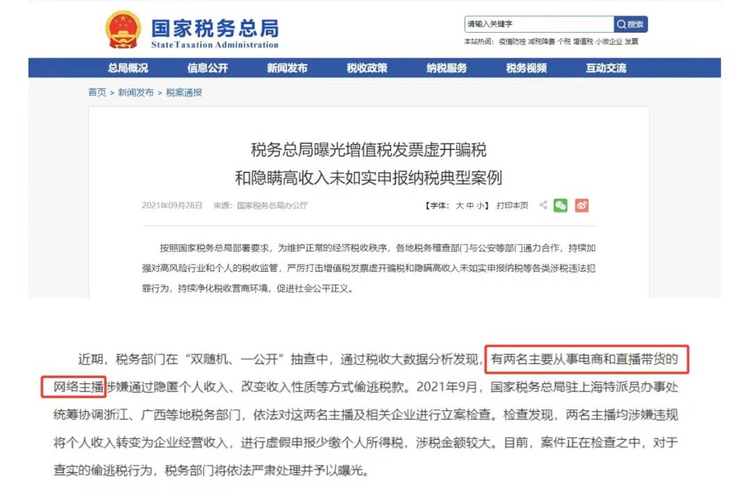 9月28日,国家税务总局曝光了一批增值税发票虚开骗税和隐瞒高收入未如实申报纳税典型案例。其中,国家税务总局特别提到,近期税务部门在抽查中通过税收大数据分析发现,有两名主要从事电商和直播带货的网络主播涉嫌通过隐匿个人收入、改变收入性质等方式偷逃税款。彼时案件正在检查中,税务部门并未点名这两位主播。但这波强力敲打,引发不少头部主播主动补缴税款。
