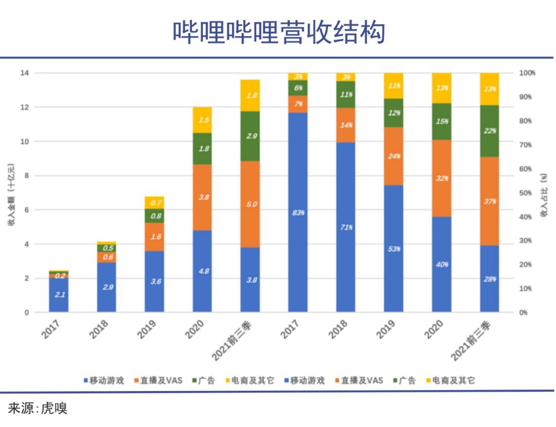 B站的广告收入甚至在随着时间推移而不断增加。到2021年三季度,占总收入的比重已达到22%。显然是优质的客群吸引了大量的广告主。