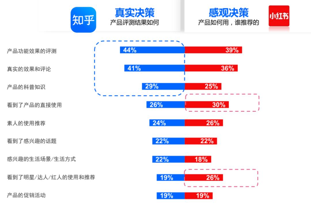 图:知乎用户偏真实决策,侧重于以评测结果或真实效果为依据, 红书用户偏体验决策,侧重于参考使用经验及人群推荐做决策。《2021~2022内容营销平台价值价值洞察白皮书》