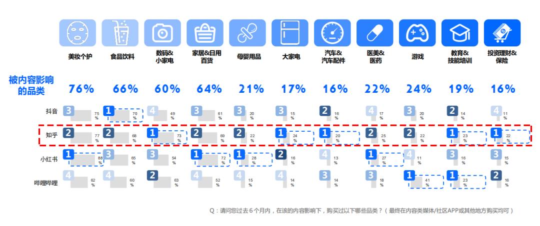 不同的内容平台,在不同的品类影响上,目前形成了自然(有意或无意)的优势。如,抖音偏重食品饮料类;知乎对数码产品、大/小家电、汽车、保险理财等品类影响较大;小红书更偏重美妆个护的影响;而B站则偏重游戏。
