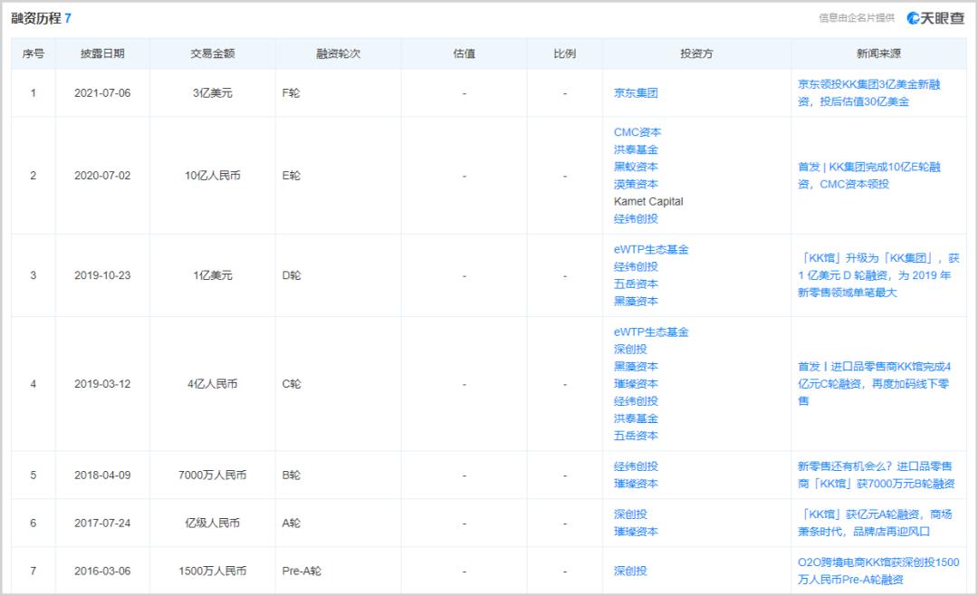 此后,随着线下新消费逐渐被资本追捧,KK集团过去5年间陆续拿到包括璀璨资本、 黑藻资本 、经纬创投、洪泰基金及京东等的7轮融资。