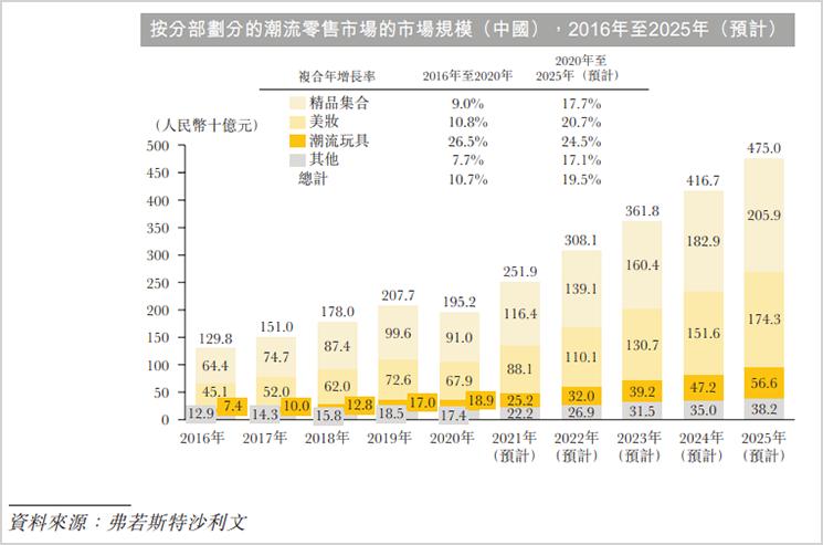 根据弗若斯特沙利文报告,按GMV计算,潮流零售市场规模从2016年的1298亿元增至2020年的1952亿元,复合年增长率达10.7%。据估计,2025年按GMV计算的市场规模将达到4750亿元,2020年至2025年的预计复合年增长率将为19.5%。